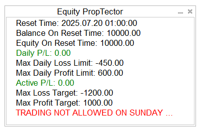 It’s an Expert Advisor (EA) that automatically protects your account from violating prop-firm rules by enforcing limits on daily loss, profit, trading days and more.